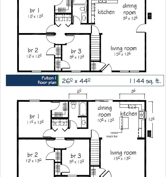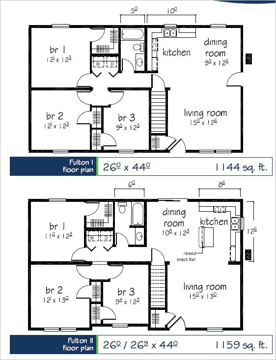 Fulton has two plans. Plan I is 1144 square feet, Plan II is 1159 square feet. Both features three bedrooms, open concept kitchen, dining room and living room, full bath.