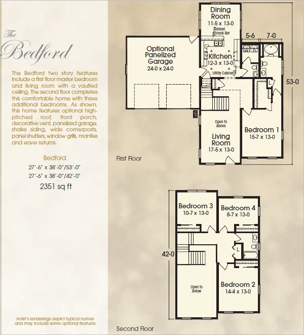 The Bedford two story features include a first floor master bedroom and living room with a vaulted ceiling. The second floor completes this comfortable home with three additional bedrooms.