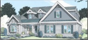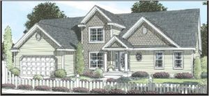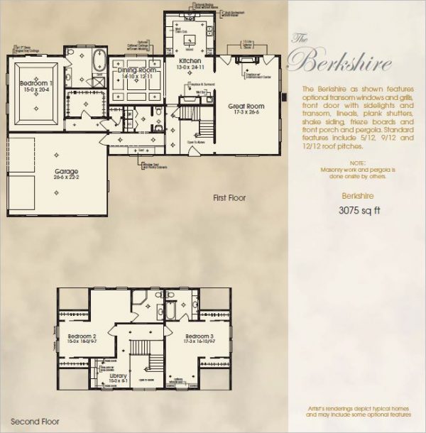 The Berkshire as shown features optional transom windows and grills, front door withsidelights and transom, lineals, plank shutters, shake siding, frieze boards and front porch and pergola. Standard features include 5/12, 9/12 and 12/12 roof pitches.