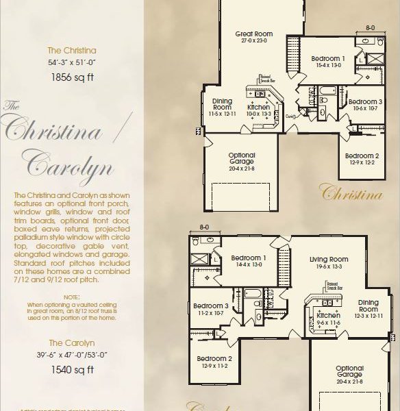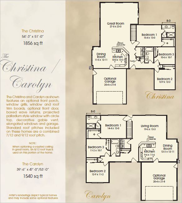 The Christina and Carolyn as shown features an optional front porch, window grills, window and roof trim boards, optional front door, boxed eave returns, projected palladium style window with circle top, decorative gable vent, elongated windows and garage. Standard roof pitches included on these homes are a combined 7/12 and 9/12 roof pitch.