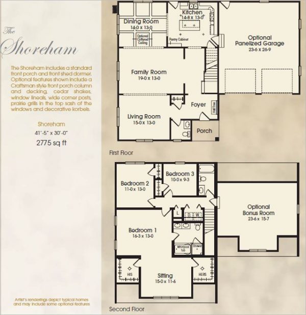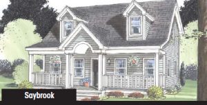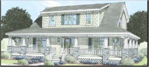 The Shoreham includes a standard front porch and front shed dormer. Optional features shown include a Craftsman style front porch column and decking, cedar shakes, window lineals, wide corner posts, prairie grills in the top sash of the windows and decorative korbels.
