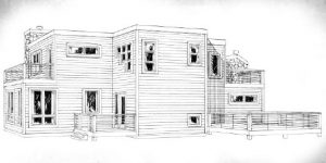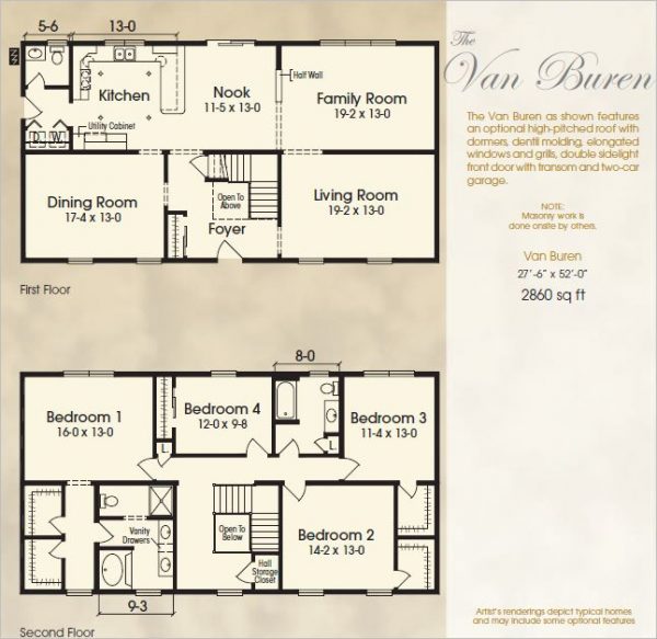 The Van Buren as shown features an optional high-pitched roof with dormers, dentil molding, elongated windows and grills, double sidelight front door with transom and two-car garage.